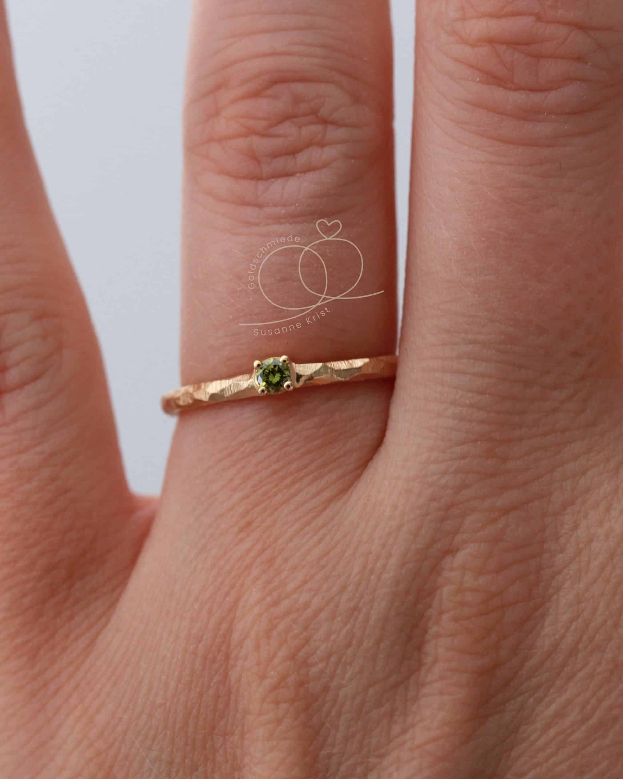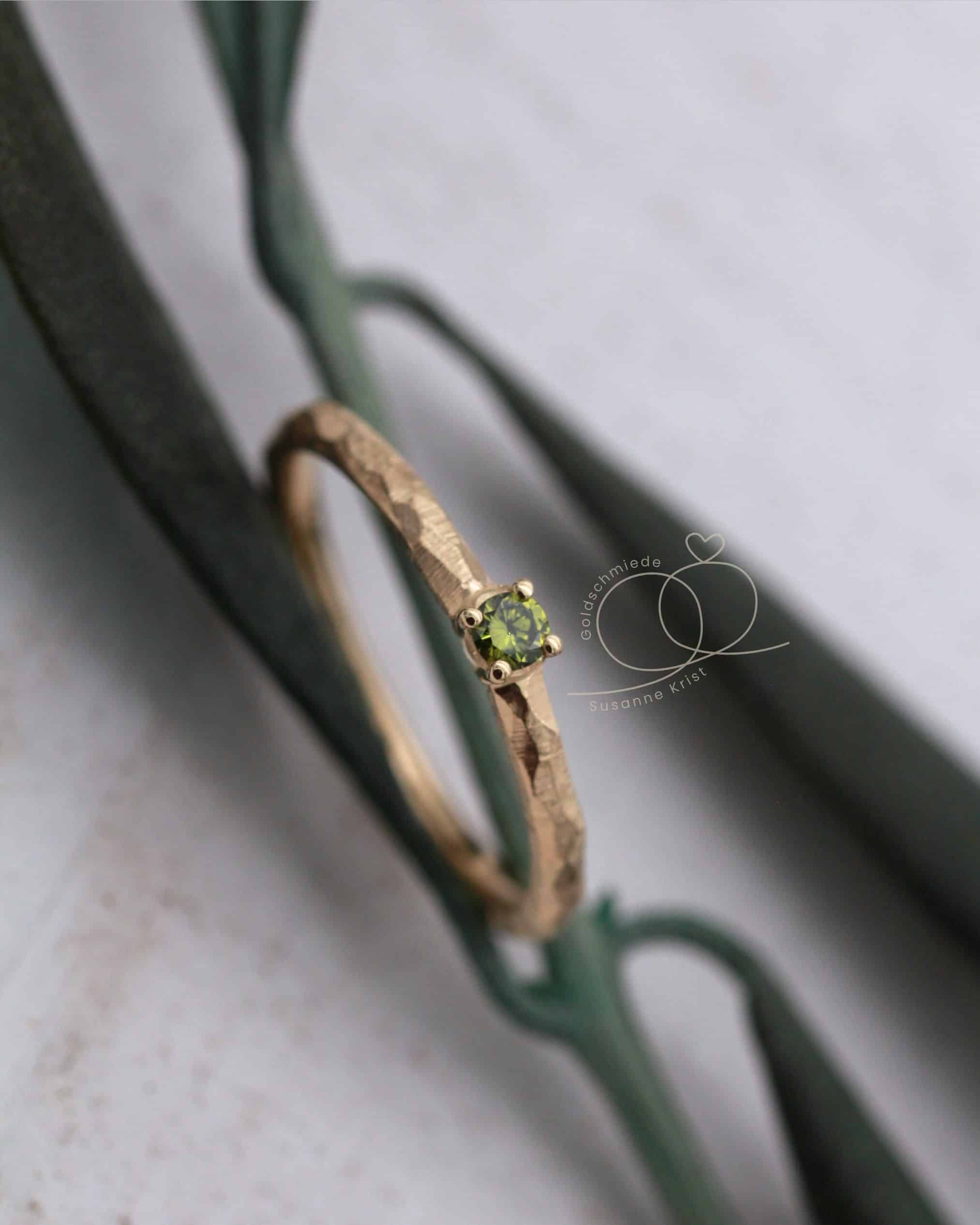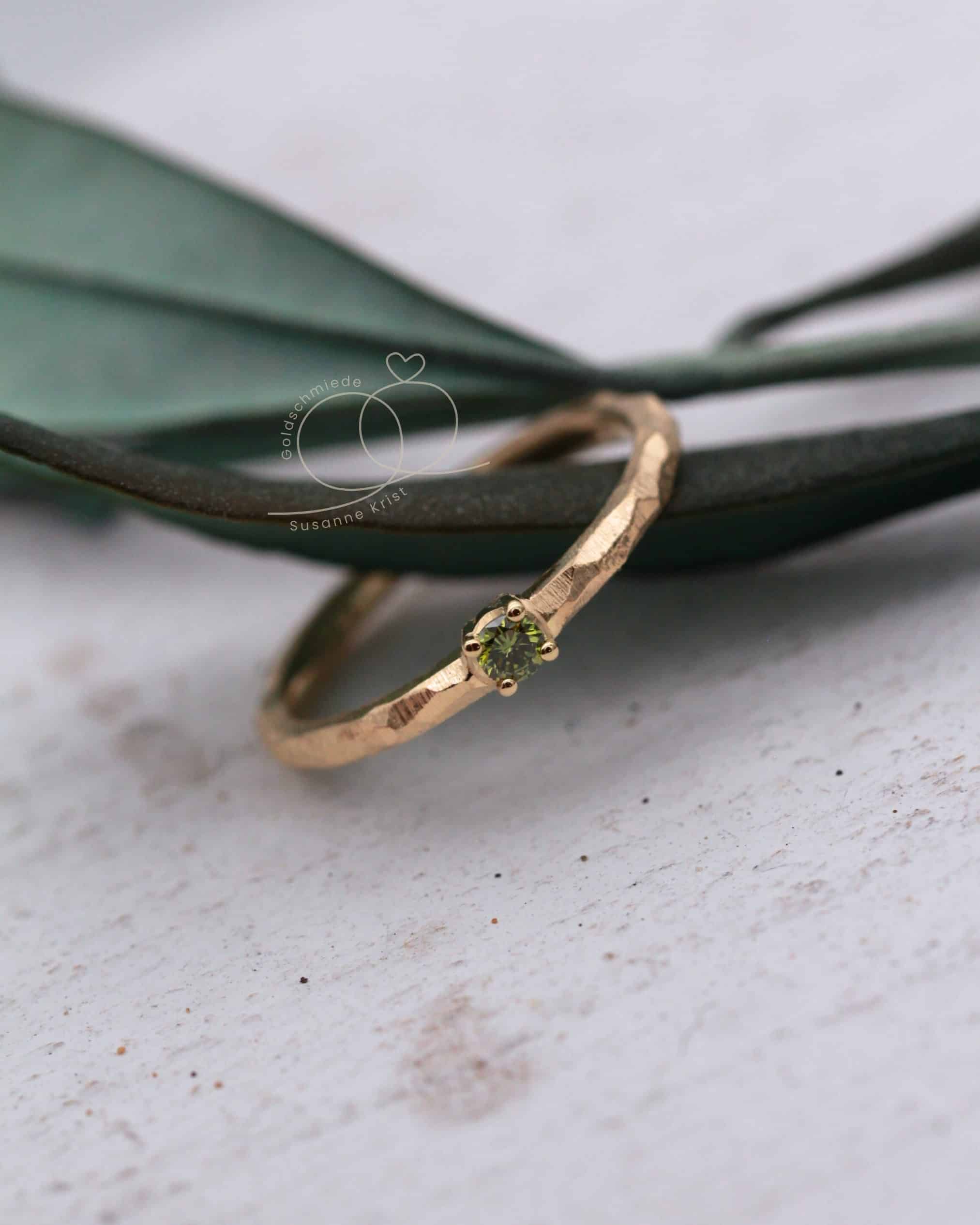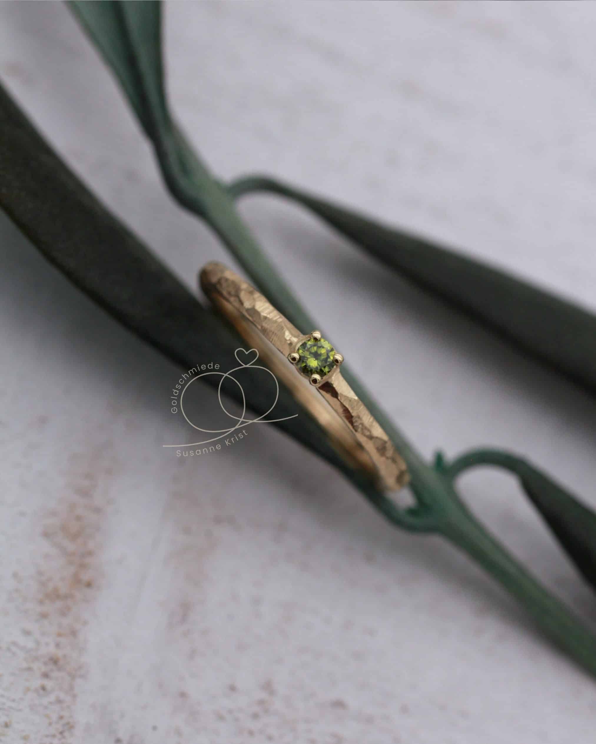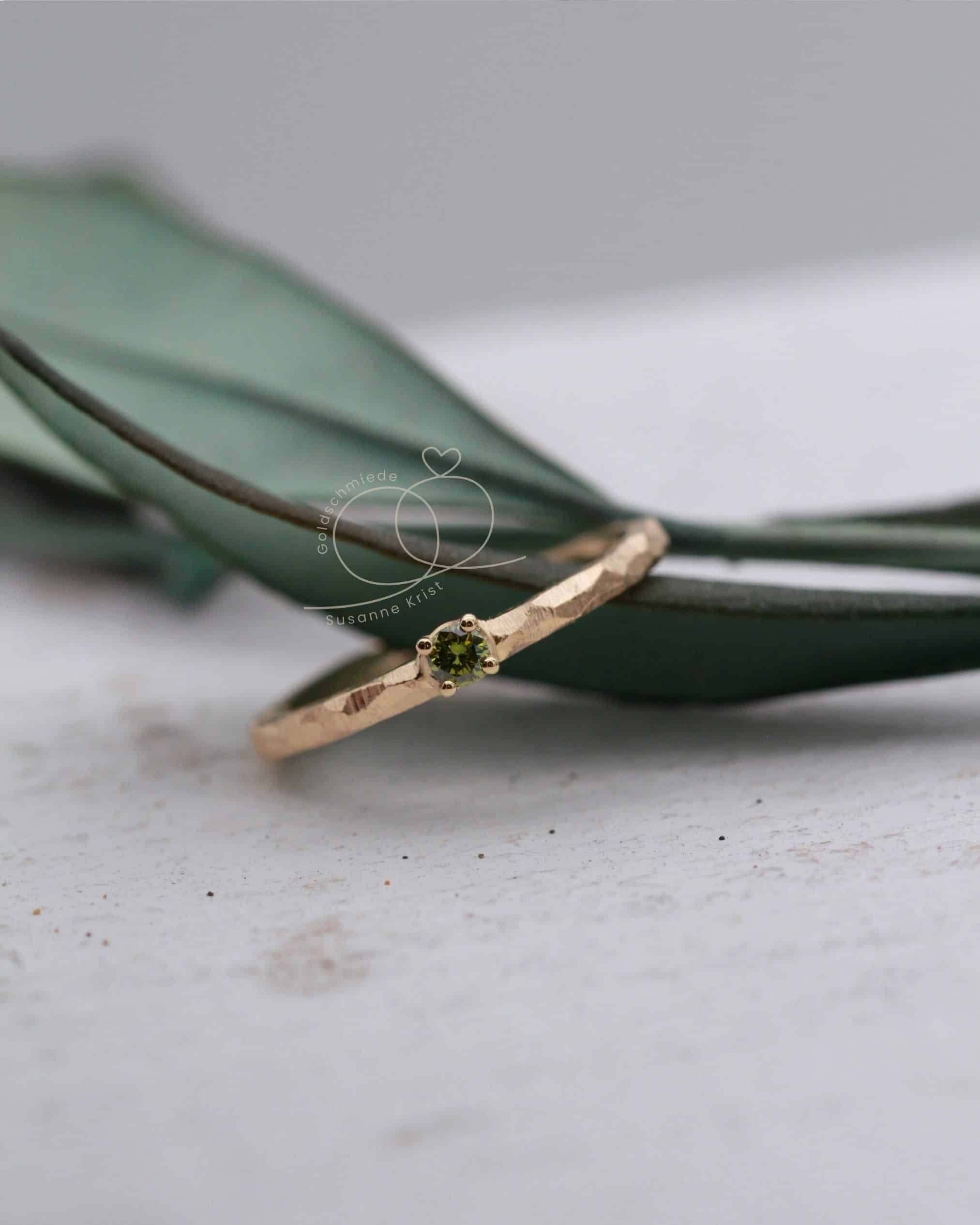 Mittig funkelt ein olivgrüner Brillant in einer Fassung mit 4 Krallen. Die Steinfarbe harmoniert sehr gut zur Farbe des Goldes.