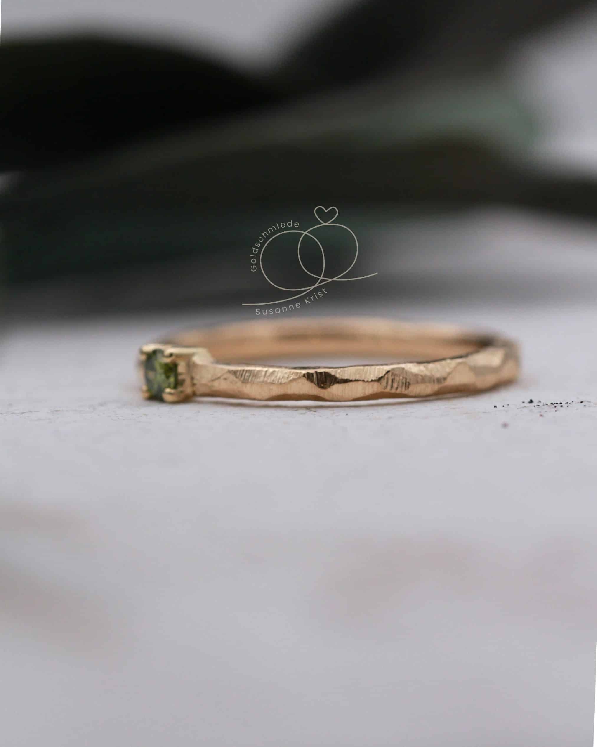 Der Verlobungsring Olivi 1 ist unter anderem einer unserer Lieblingsringe, weil er eine ganz besondere Ausstrahlung hat. Durch die Kombination von grünem Stein und der hübschen Ringoberfläche erinnert der Ring an Olivenbäume und Sommer. Ist deine Liebste ein naturverbundener Mensch und mag Grüntöne, ist dieser Ring genau richtig. Der etwas andere Verlobungsring eben.